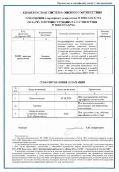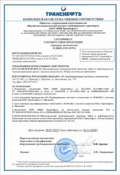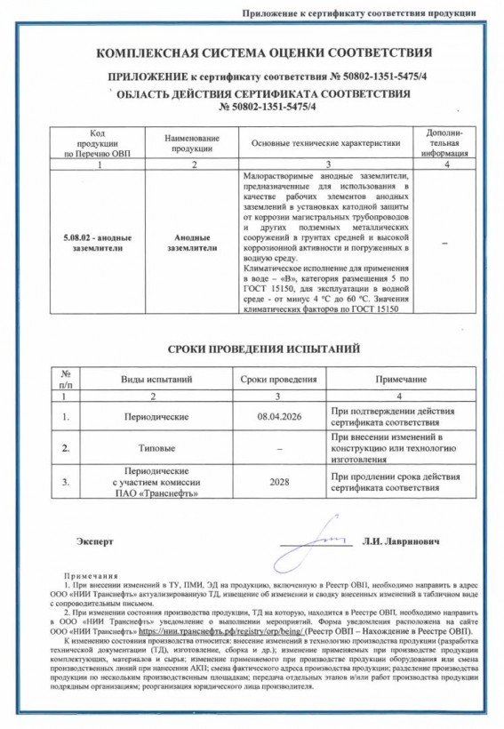 Сертификат соответствия № 50802-1351-5475/4 о соответствии требованиям нормативных документов ПАО «Транснефть» ОТТ-29.100.99-КТН-0525-23 «Магистральный трубопроводный транспорт нефти и нефтепродуктов. Электрохимическая защита. Анодные заземлители. Общие технические требования» на продукцию:
