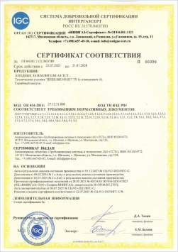 Сертификат соответствия № ОГН4.RU.1121.ВО3789 в Системе добровольной сертификации ИНТЕРГАЗСЕРТ требованиям нормативных документов: ГОСТ Р 9.607-2022 п.п. 5.1.1.1, 5.1;] .2, 5.1.1.3, 5.1.2.1, 5.1.2.2, 5.1.2.3, 5.1.2.4, 5.1.2.5, 5.1.3.1, 5.1.3.2,5.1.3.3, 5.2.1, 5.2.4, 5.2.5, 5.2.5.3, 5.2.5.4, 5.2.6, 5.2.7, 5.2.8, 5.2.9, 5.2.10, 5.2.11, 5.2.12, 5.2.13, 5.2.14, 5.2.15, 5.2.16, 5.2.16.1, 5.3.1, 5.3.2, 5.4, 5.6.1, 5.6.2, 5.6.3, 5.7.1, 5.7.2, 5.7.3, 5.7.4, 5.8.1, 5.8.2, 5.8.4, 5.8.5, 5.8.6, 9.1, 9.2. на продукцию: