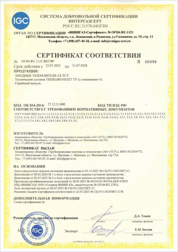 Сертификат соответствия № 50802-1351-5475/4 о соответствии требованиям нормативных документов ПАО «Транснефть» ОТТ-29.100.99-КТН-0525-23 «Магистральный трубопроводный транспорт нефти и нефтепродуктов. Электрохимическая защита. Анодные заземлители. Общие технические требования» на продукцию: