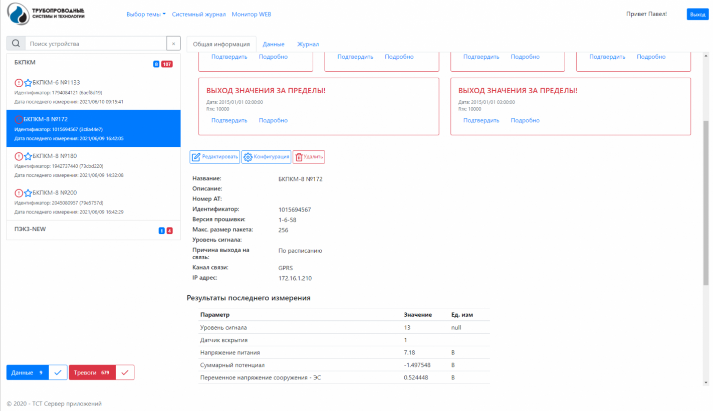 - сбор измеренных значений скорости коррозии и других параметров защищаемого объекта с оборудования подсистемы дистанционного коррозионного мониторинга, станций катодной и дренажной защиты, в том числе тревожных и аварийных сообщений и их отображение, сопровождаемое звуковым сигналом;